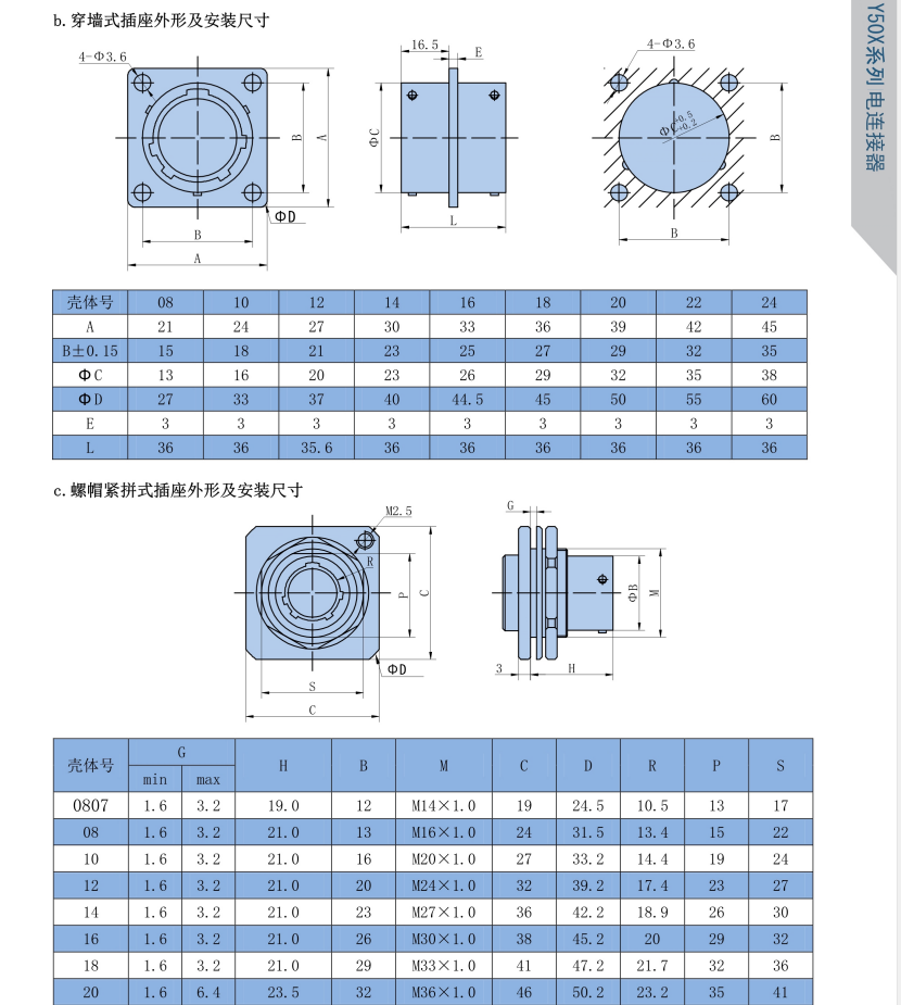 該系列航空插頭分三大類,Y50X是公制尺寸,同芯數(shù)外殼體尺寸偏大,插座安裝方式有方盤式,螺母緊固式及穿墻式,端接形式為焊接式,根據(jù)使用環(huán)境選擇不銹鋼或銅、鋁合金材料,一般用于戰(zhàn)略戰(zhàn)術(shù)系統(tǒng),電子對抗系統(tǒng),通訊信號連接系統(tǒng) ,進(jìn)口醫(yī)療儀器設(shè)備等電能,電訊信號的連接。
