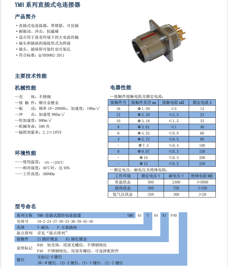 YMH系列直插式電連接器 ,接觸件粗,電流大,端接形式焊接,插頭和插座即可裝針也可裝孔,殼體壁厚,耐振動,沖擊,抗磕碰,適用于室外大電流設(shè)備電流的傳輸。