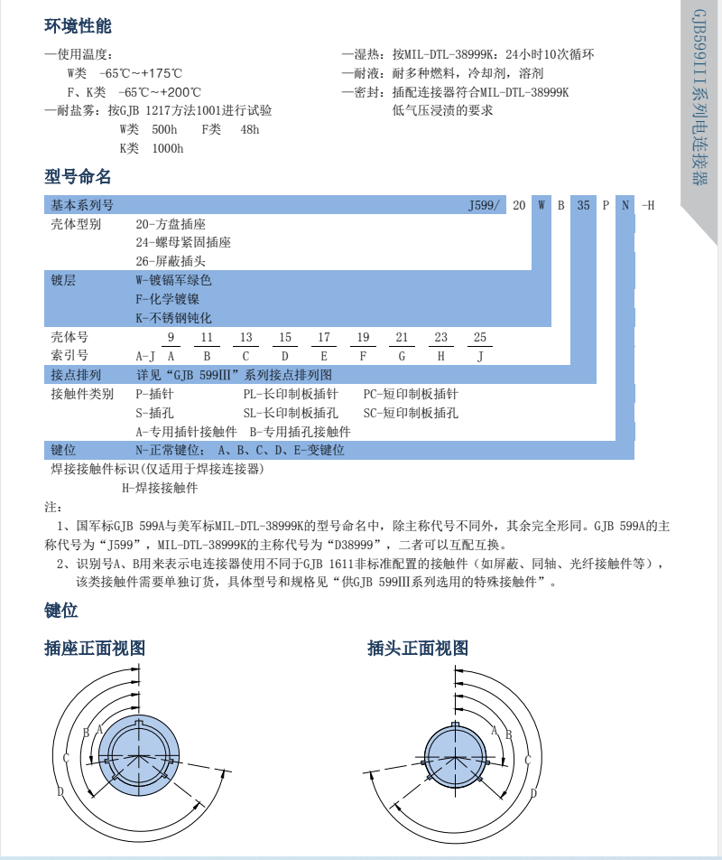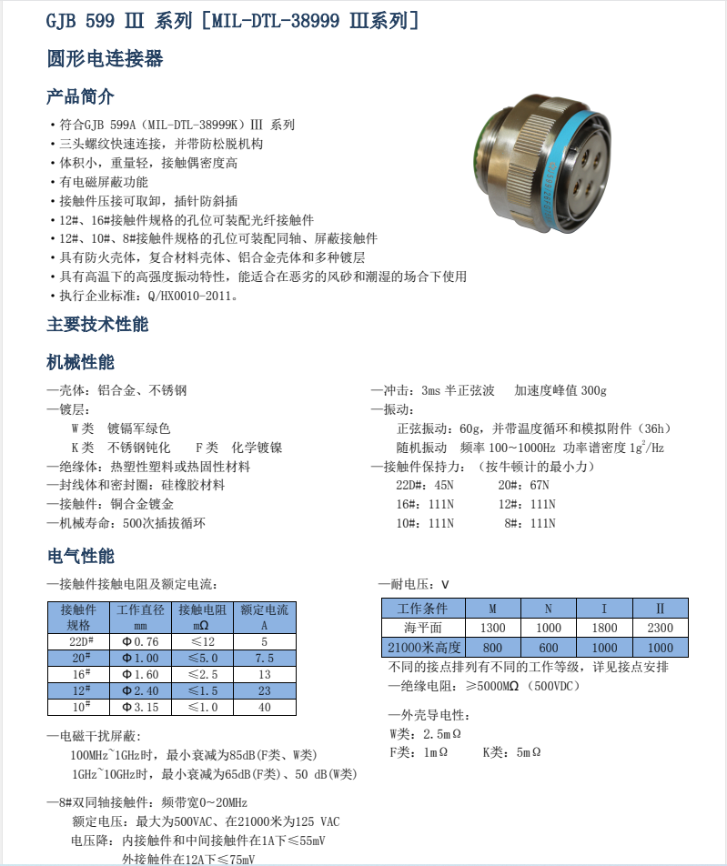 MIL-DTL-38999KIII系列圓形電連接器,符合GJB599A要求,三頭螺紋連接,并帶防松脫機構(gòu),性能與599II系列相反,具有高溫度下高強度的振動,適合在惡劣的環(huán)境工作。