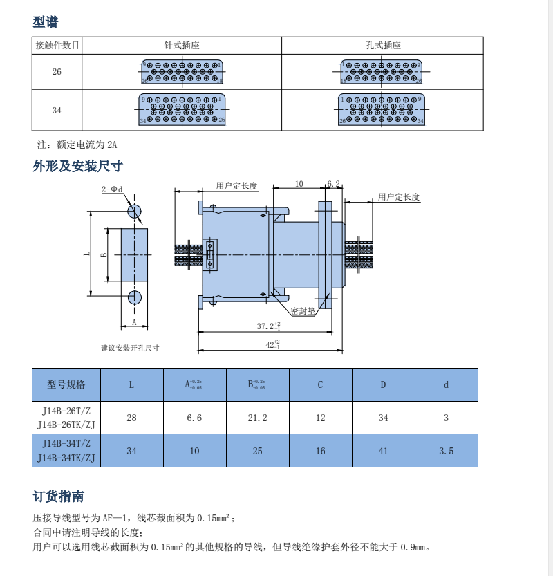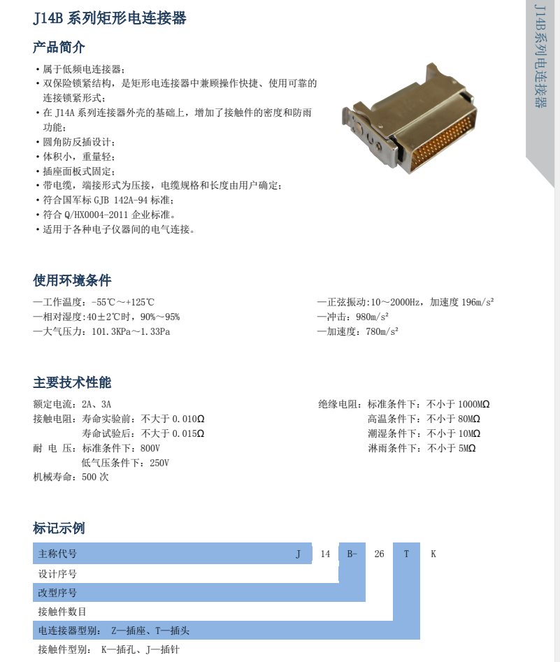 J14B系列矩形電連接器,在J14A連接器外殼基礎(chǔ)上,增加了接插件的密度和防雨功能,壓接式,電纜長度有用戶確定,適用于各種電子儀器間的電氣連接。